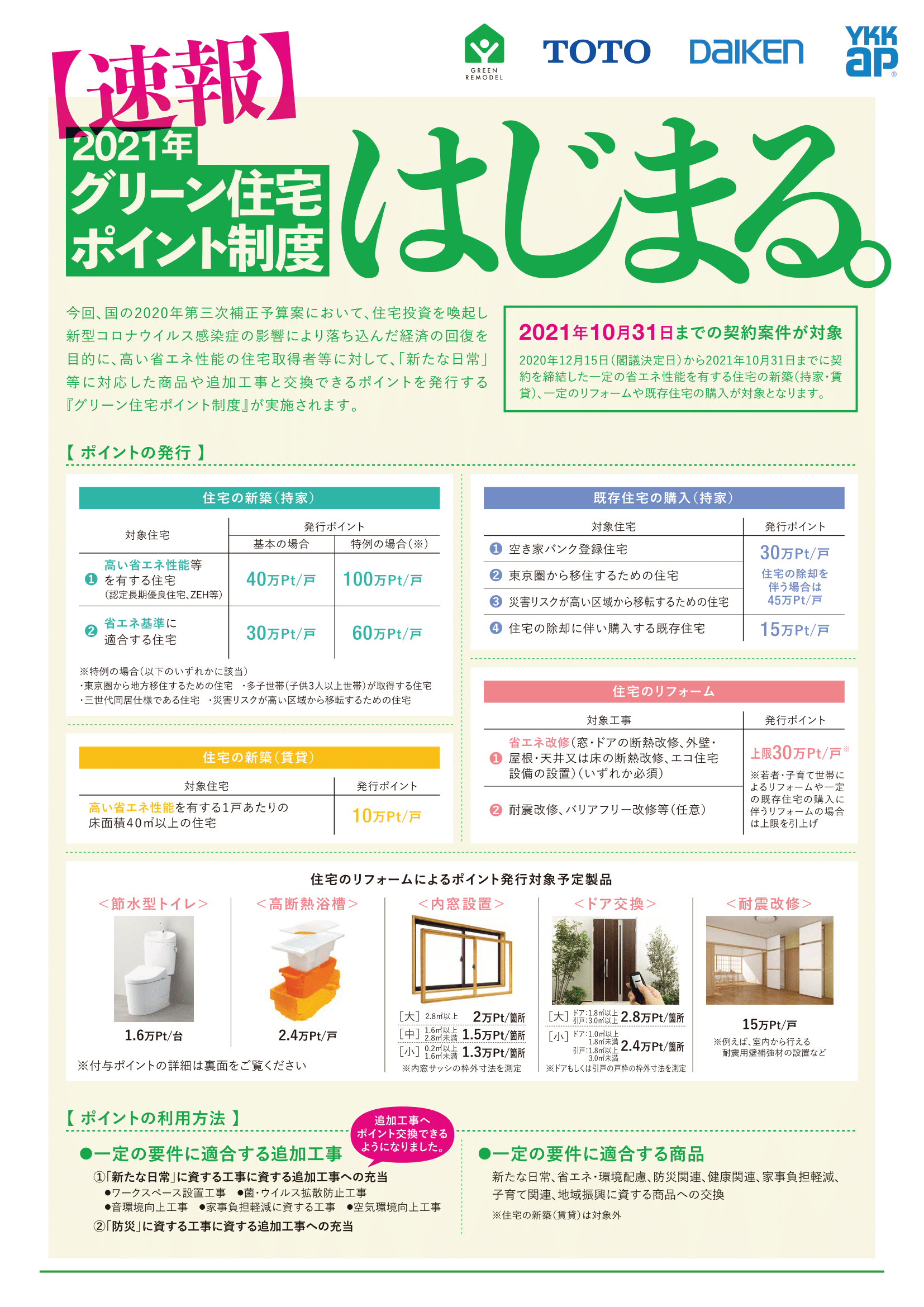 国土交通省「グリーン住宅ポイント制度」が始まっています!!〈終了しました〉 イベント 2021.05.06 住宅のリフォームで 最大30万円相当のポイントが獲得できます。 対象期間:2021年10月31日(予算終了次第終了) « 前へ お知らせ最新情報・お知らせ 次へ »