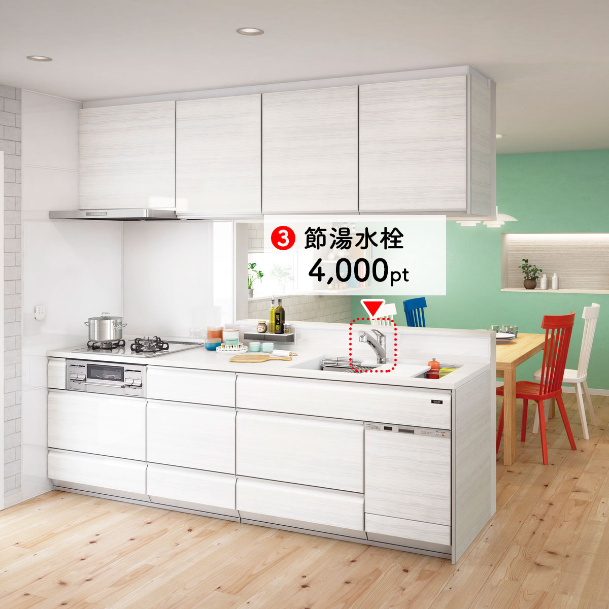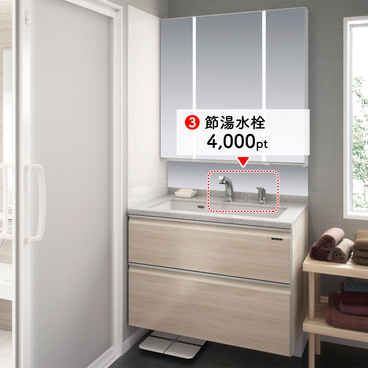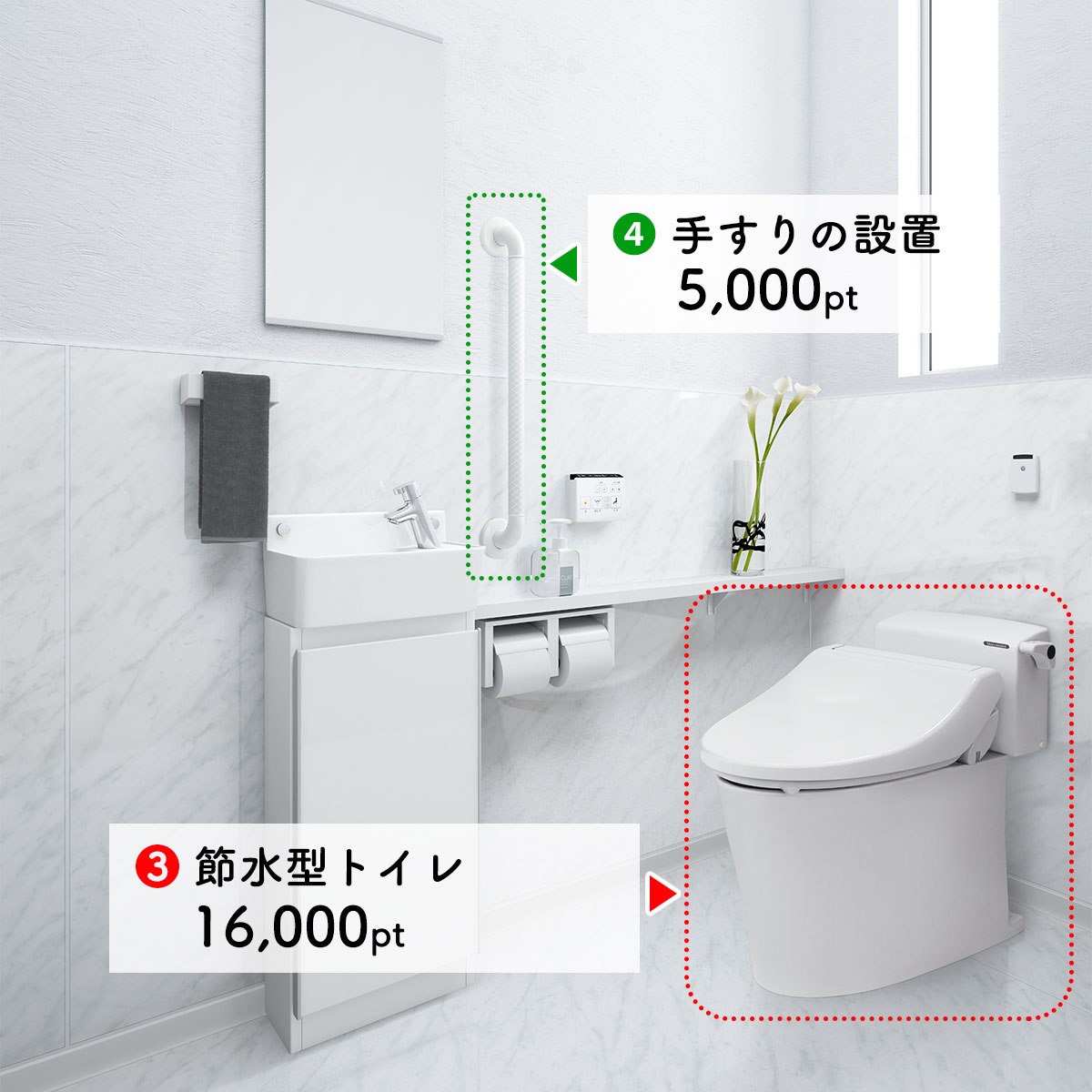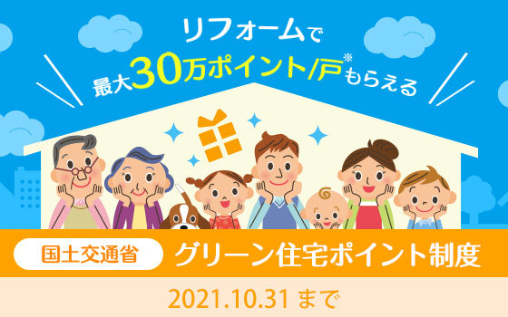 要件を満たす住宅の建築や購入、リフォームを行った方に、対象製品の合計が5万pt~30万ptまで商品交換や追加工事に利用できるポイントを発行する制度です。