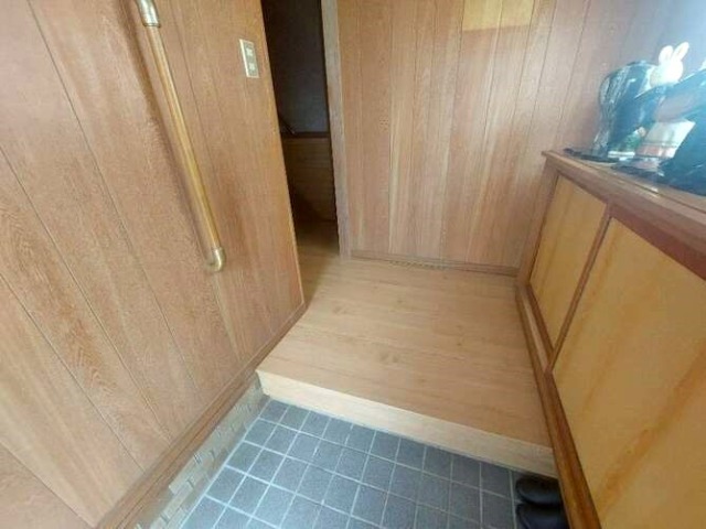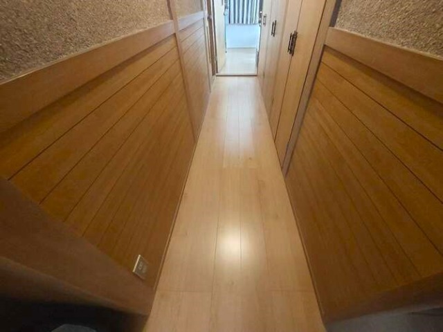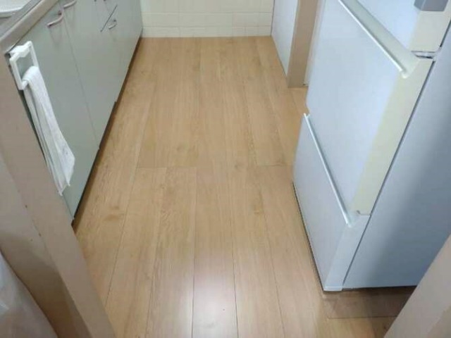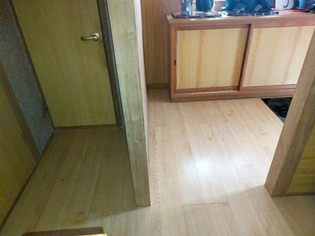 築後一度も貼り替えていないと思えないほどきれいな床ですが、生活動線でよく通る箇所はぶかぶかして歩くたびに床が抜けるのではないかと心配でした。玄関からリビングを同じフローリングに貼り替えて明るい室内になりました。Before