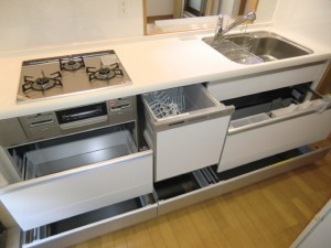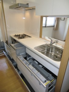 マンションのシステムキッチンのリフォームです。見た目の美しさももちろんキッチン選びの大事なポイントですが、A様はさらに引き出しの内部までいつまでも清潔に使えるキッチンを選びました。クリナップのクリンレディは引き出し内部も全てステンレス仕上げのため、うっかり調味料などをこぼしてしまっても汚れや臭いが付きにくく大変衛生的です。シンク内部も特殊コーティングを施しておりキズや水あかを抑えキレイが長持ちします。また今まで食器洗い乾燥機は据え置きタイプだったため圧迫感がありましたが、新しいキッチンは埋め込み式のためシンクも広々と使える上、収納部分は全て引き出し式となり使い勝手も大変よくなりました。| 主な商品 / 設備 / 素材 | クリナップ クリンレディ |