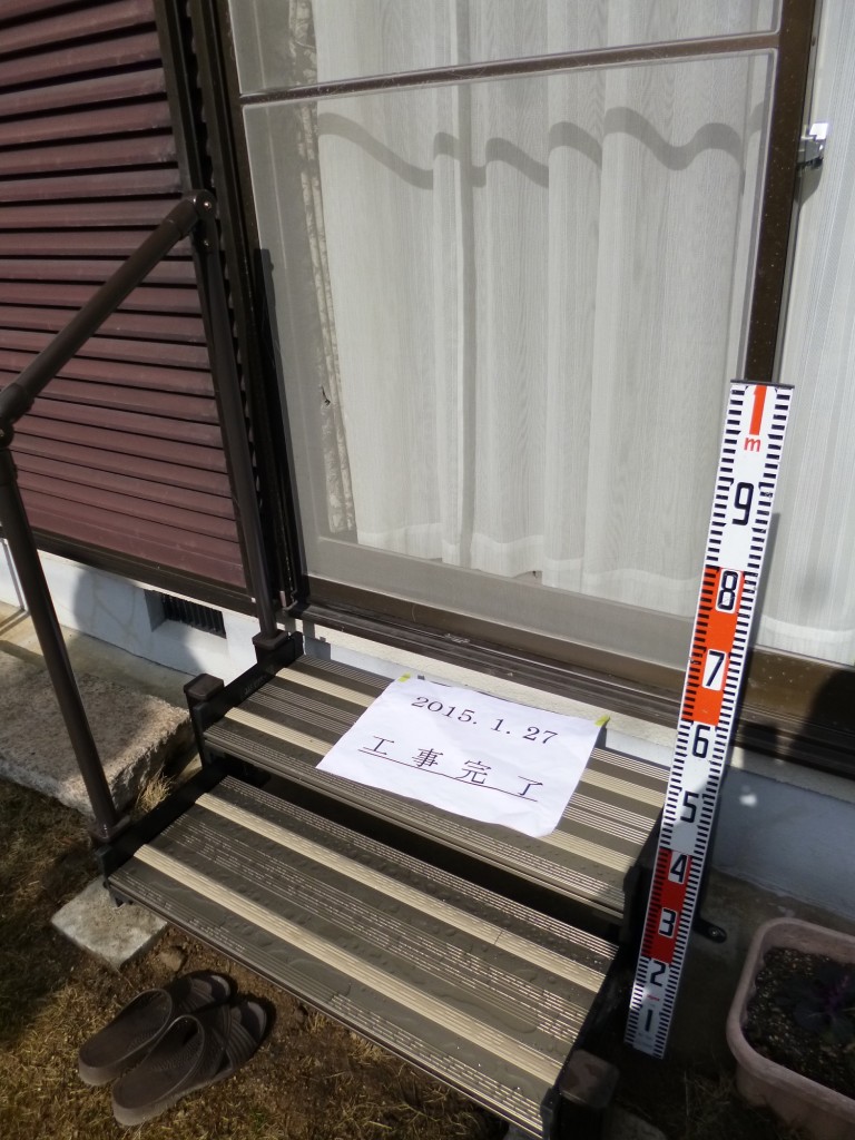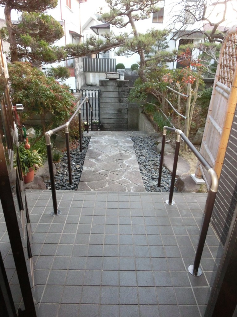 浴室や各部屋間の敷居など、家中の様々な箇所に段差があり施主様ご自身やご家族様がつまづきによる転倒を心配されていました。今回、神戸市住宅改修助成事業と介護保険住宅改修制度を利用されての改修工事となりました。神戸市住宅改修制度の申請後、ご自宅にて作業療法士や建築士の先生方と弊社スタッフがご本人のお体の状態を拝見して改修が必要な箇所を判断します。主な工事は以下の通りでした。①在来浴室をユニットバスに改修して段差をなくす ②トイレの段差をなくして廊下と面一にする ③玄関、廊下から居室までの動線に手すりを充実させる ④屋外用手すりやステップ台を設置する ⑤敷居を取り建具の継ぎ足し補修と、ドアノブを握り玉からレバーハンドルに取替える。 出来上がりに施主様も大満足です。 特に驚かれたのは庭に設置した手すりつきのステップ台。以前は縁側から庭に降りる際に40cm以上の段差があり、庭石を置いていましたがグラグラして足元が不安定でした。2段ステップと手すりにより便利さと安全性が格段に向上しました。『こんな便利なものがあるんですね!』とおっしゃり、早速ご利用になっていらっしゃいました。Before