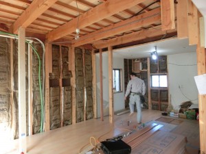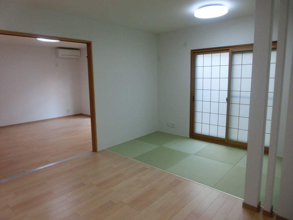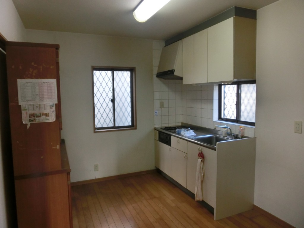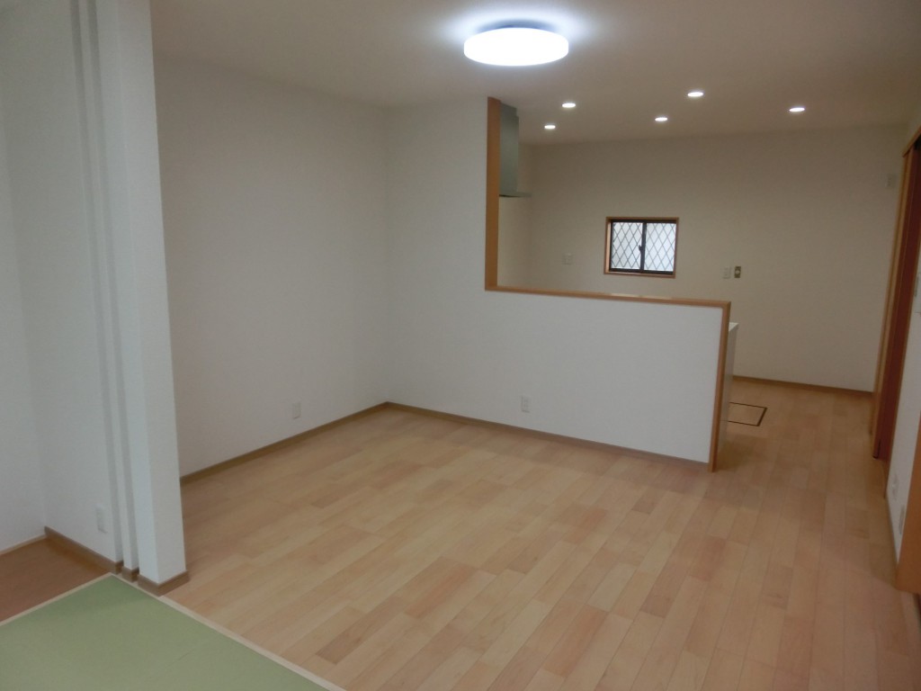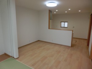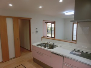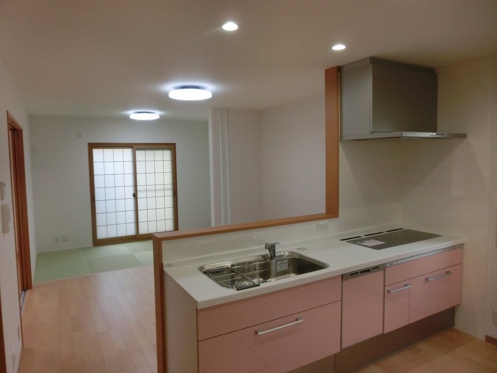 改修前の独立型のキッチンはかなりの広さがあったため、余剰スペースが多い上に他の部屋との繋がりも悪く、部屋の間取りに不満を感じていました。リフォームにより大胆に部屋の間仕切り壁を取り払い、キッチンとリビングとが一体感あるLDKスペースへと生まれ変わりました。床のリフォームの色目とキッチンの淡いピンク色が折り合って、お部屋全体が優しい雰囲気に仕上がっています。また、お仏壇を置く場所を確保したいというお施主様のご要望により、LDKの一画に畳スペースを設けました。フローリング部分との間にデザイン性を持たせて造作した壁が、ゆるやかな間仕切りの役割を果たしています。| 主な商品 / 設備 / 素材 | |