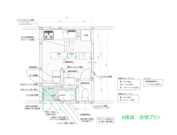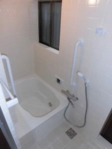 浴室は、在来タイル浴室からユニットバスへの改修をご希望されていましたが、既存浴室が変形タイプで工事は難しく、代わりに深さがあり出入りしにくかった浴槽を、浅型浴槽に入替え幅も拡張して以前より脚を楽に伸ばせるようになりました。さらに、浴室内全てのタイルの貼り替えや手すりの取り付けにより、大変明るくかつ、安全な浴室へと生まれ変わりました。