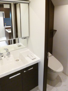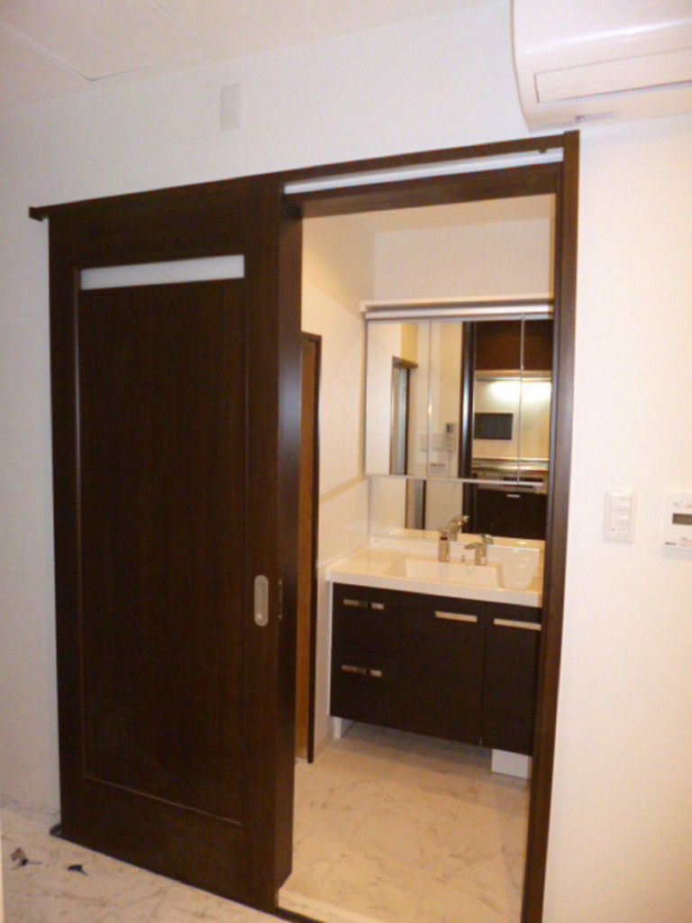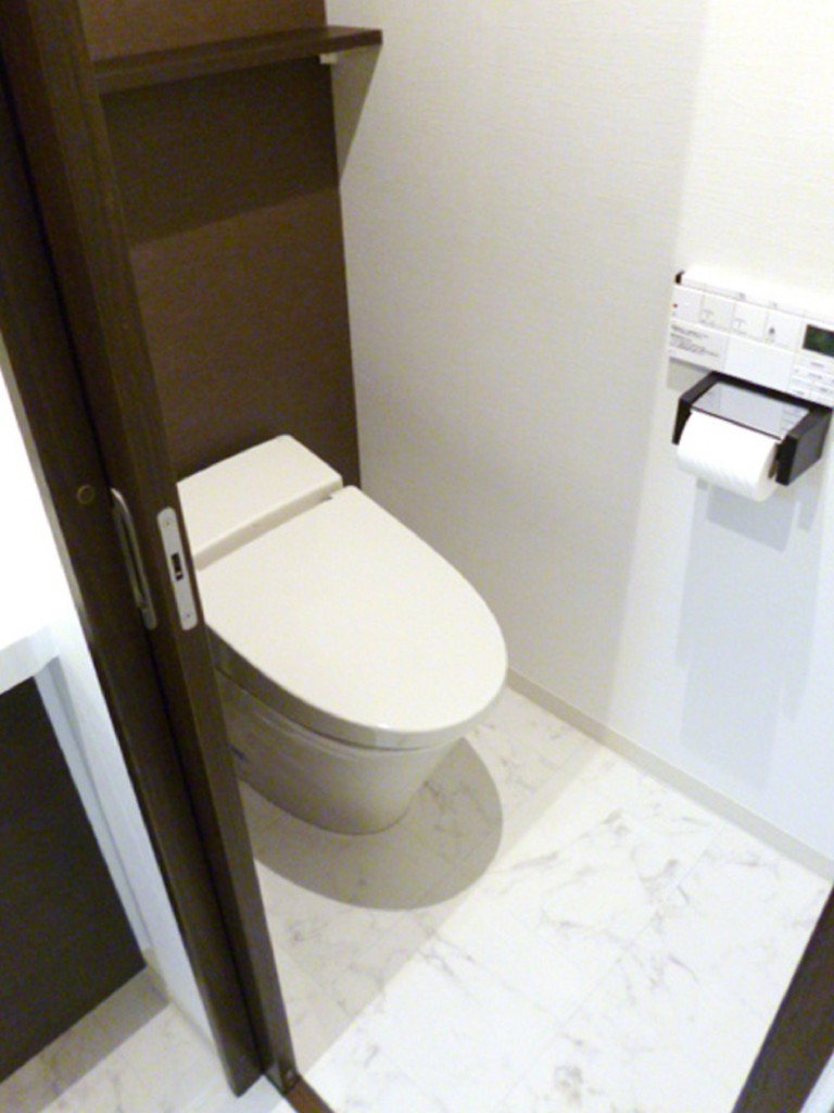 中古一戸建て住宅1階部分の大規模リフォームでトイレと洗面室が劇的に変化しました。工事のメイン部分であるキッチンの色調と合わせて水廻りも設備機器のブラウン系色と内装材のホワイト系色のツートンで、落ち着きを持ちつつスタイリッシュな雰囲気に仕上がりました。タンクレストイレを設置したため、通常あるタンクによる圧迫感が無くトイレ内に広がりを感じさせます。洗面室の入り口も開き戸から引き戸に取替えることにより、開閉スペースを取らず使い勝手もよくなり大満足の仕上がりとなりました。