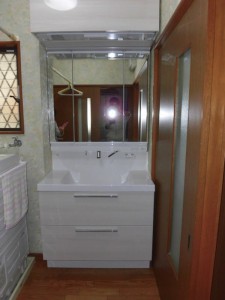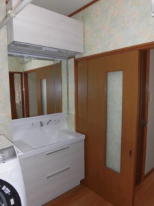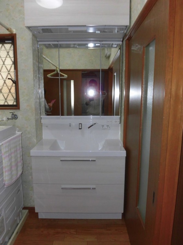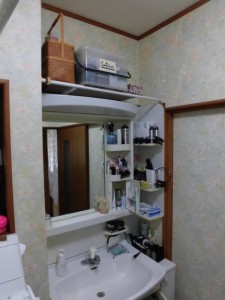 また、既存洗面所には横手に収納棚を設置したり、上部には突っ張り棒を取り付けるなど工夫して収納スペースを確保されていましたが、リフォームにより洗面化粧台の幅自体を広げ、かつ引き出し収納式にすると共に、上部にはダウン機構付の収納部を取り付けることにより、大容量の収納が可能な大変落ち着いた空間へと生まれ変わりました。